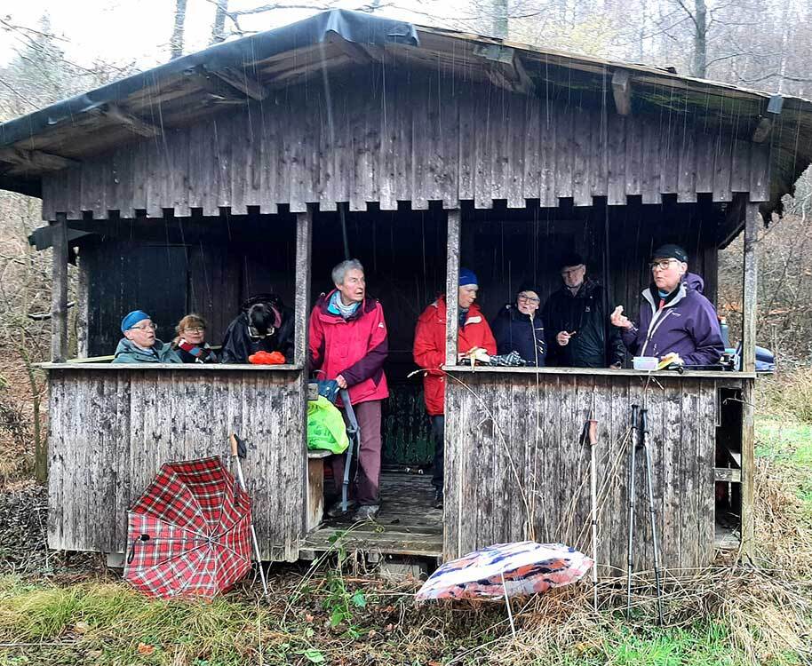 Zufällig stieß die Gruppe unterwegs auf einen Schuppen an einem aufgelassenen Fischteich, der sogleich für eine Pause in Anspruch genommen wurde, denn es bot sich sonst kaum eine Gelegenheit für einen einigermaßen geschützten und trockenen Unterstand.