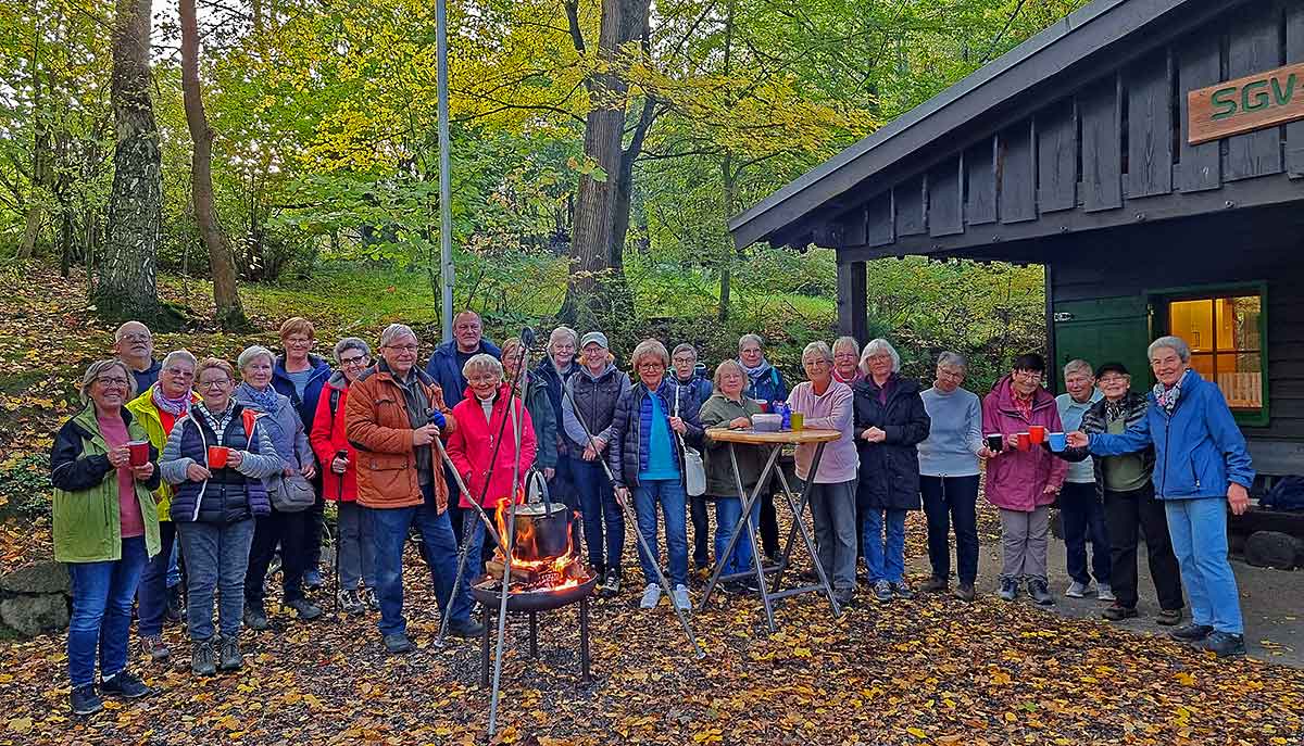 Auf der letzten „kug”-Wanderung dieses Jahres am 31. Oktober 2023 ging es mit Wanderführer Helmutheinz Welke vom Neheimer Markt durch das Neheimer und Bachumer Ohl. Über Bergheim kehrten die Wanderinnen und Wanderer dann zur Hütte zurück, wo unser Wanderfreund Wilfried Hellmich bereits über offenem Feuer seinen rustikalen Holzfällerkaffee anrührte. Derweilen hatte Beate Wojtyniak mit einigen Helferinnen fast 200 Schnittchen mit Leber- und Blutwurst, Schinken und Käse, Mett und Griebenschmalz zubereitet.