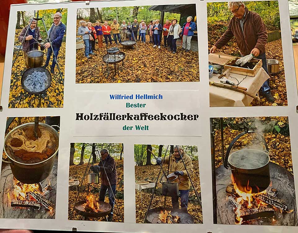Die Platten wurden fast restlos geleert, ebenso der 12 Liter fassende Kaffeetopf, was sowohl für den Appetit der Gäste als auch für die Qualität des Angebots spricht. Dabei wurde Wilfried Hellmich eine besondere Auszeichnung zuteil. In Würdigung der Verdienste, die er sich inzwischen durch seine unnachahmlichen Kaffeekreationen erworben hat, wurde ihm das Zertifikat als „Bester Holzfällerkaffeekocher der Welt” verliehen.