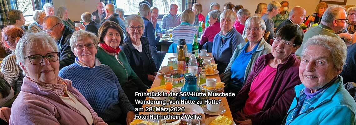 Wir beteiligen uns am Samstag, dem 28. März 2026 an der Gemeinschaftswanderung der Arnsberger SGV-Abteilungen „Von Hütte zu Hütte”. Die Teilnehmenden fahren mit dem Bus um 8.45 Uhr vom Busbahnhof Neheim nach Müschede und wandern dort 700 Meter bergauf zur SGV-Hütte, wo ein reichhaltiges Frühstück zum Preis von 9 Euro serviert wird.
